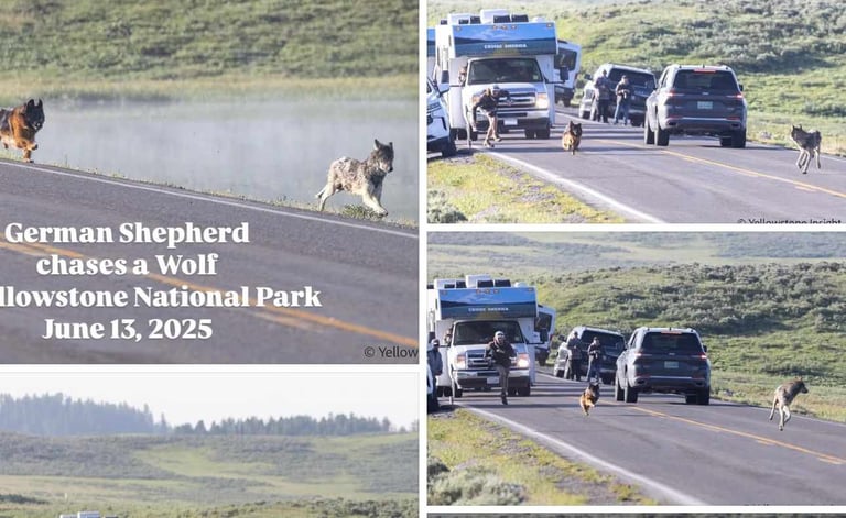 German Shepard chasing a Wolf in Yellowstone National Park