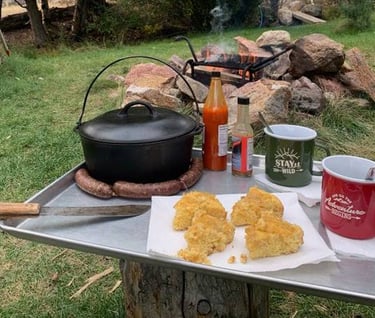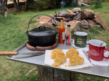 Sweet & slightly spicy ham & beans in a cast iron pot over the campfire. It is served with homemade cornbread and homemade creamed honey butter.