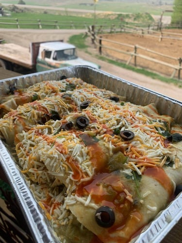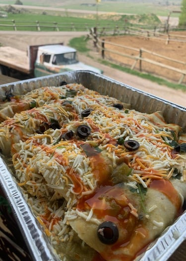 Do you want take an evening off? Then call to order a to go of our homemade cheesy chicken enchiladas in a green sauce, or elk burger in a red sauce. Served with homemade refried beans & rice!
